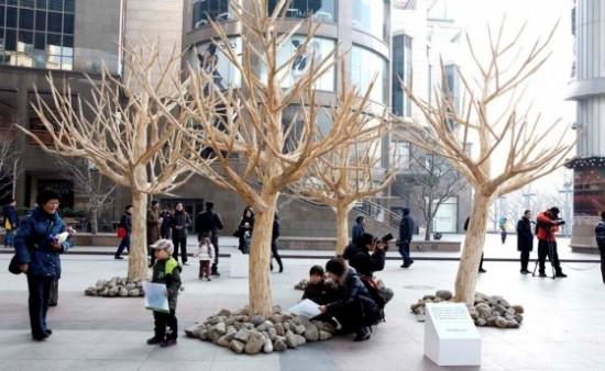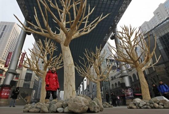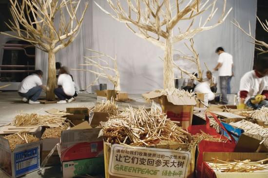 Cerca de 200 voluntários de várias universidades de Pequim atenderam ao “chamado” do Greenpeace e se reuniram para coletar hashis (o nome tradicional do popular “pauzinho”) em restaurantes da capital chinesa. Eles limparam o material e montaram árvores com ele, esperando conscientizar os chineses da forma com que eles gastam recursos naturais.